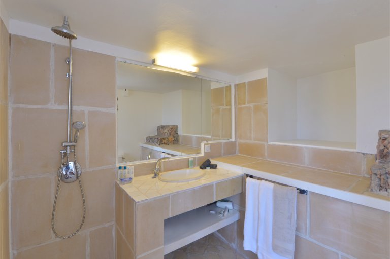The common areas, music room, and three of the bedrooms are on the main level, which also has the coded entrance gate. Two of these bedrooms have king-size beds, and the other has a queen. The fourth bedrooms is on the lower level with twin beds that can be made up as a king. Each of the bedrooms has an ensuite bathroom with a rain head shower. The bedroom downstairs has a private terrace.