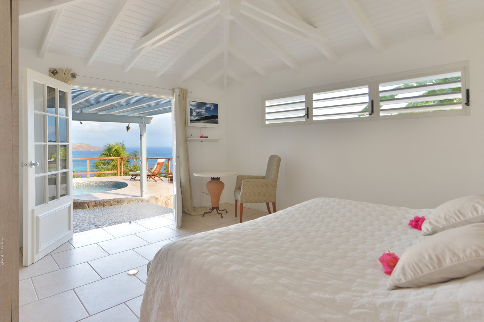 Villa Sunrise (KAR) is a traditional St. Barth villa with a twist. The luxury rental property comes with all of the expected features and amenities and one that is not: a music room with instruments. Music lovers of all styles will love the drums, electric guitars, and amplifier, as well as the lounge chair and ocean view for any would-be spectator.