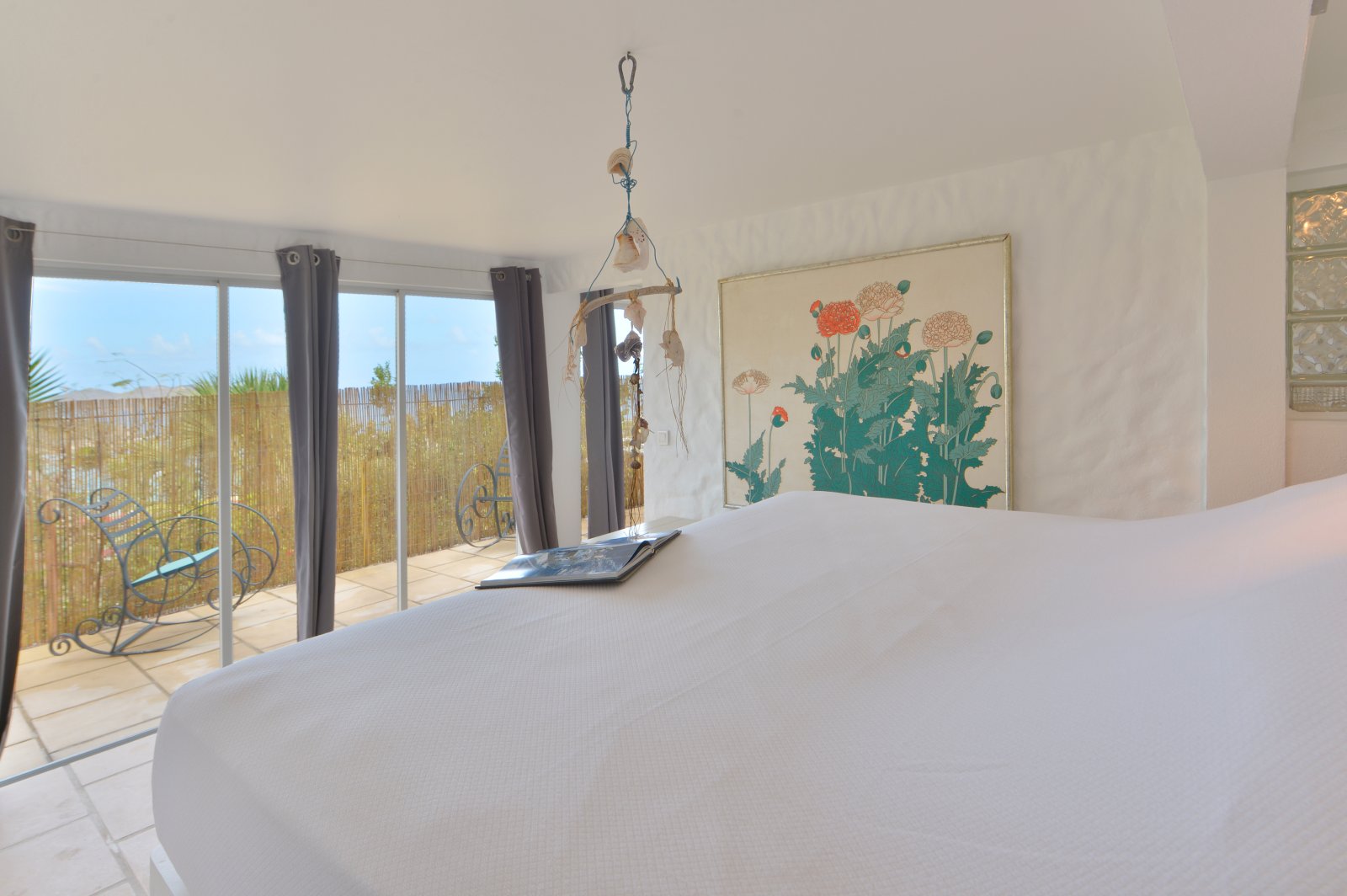 Indoors there are intriguing textures, such as a mosaic-style wall behind a bed and long curtains tied with tassels and puddled on the floor, and soothing colors. But it is important to note that only the four bedrooms are fully inside.