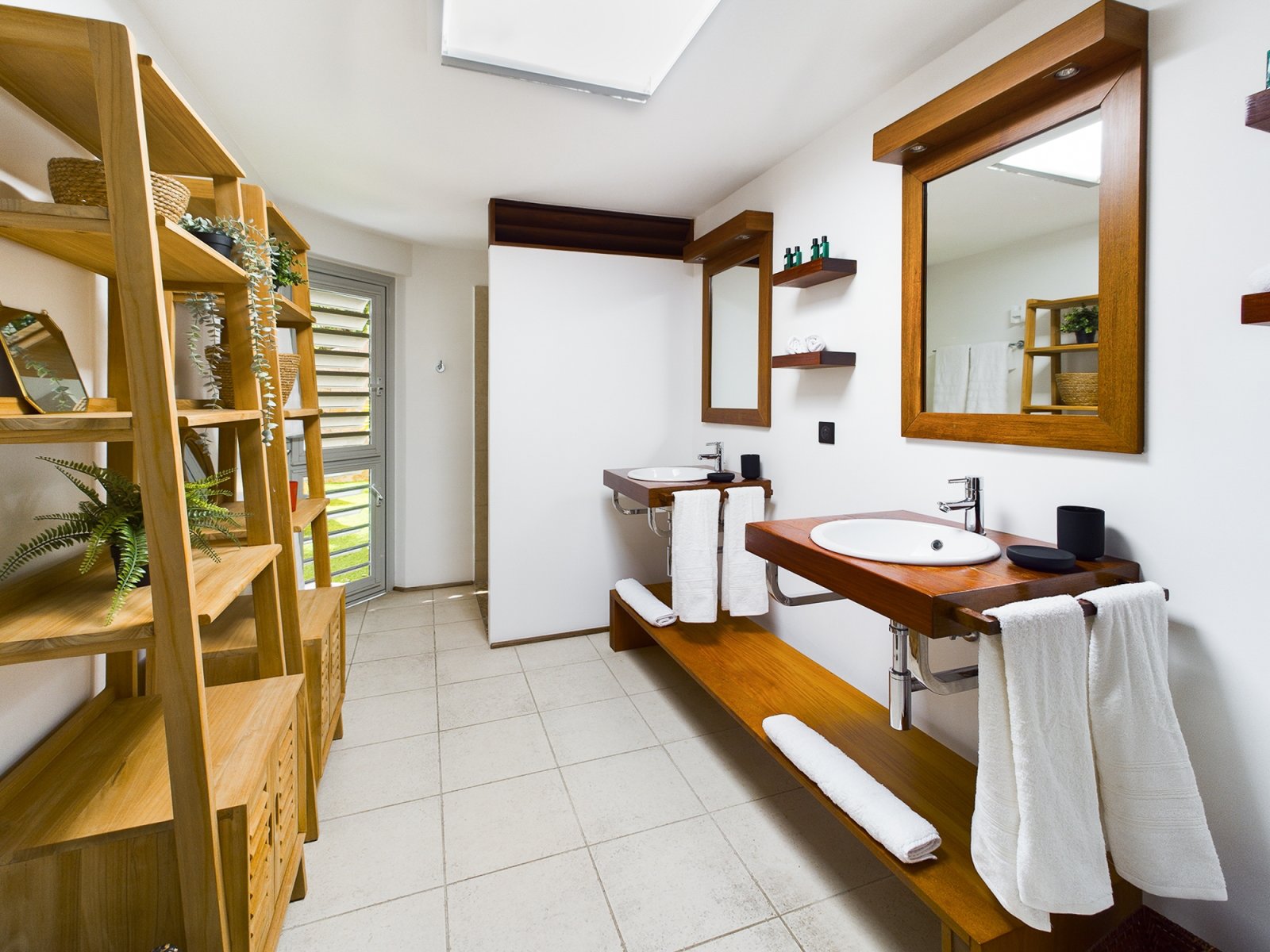Aside from a parking area one level below the living space and bedroom 4, Villa Vi is spread out on one floor. The primary bedroom lies to one side of the living area and kitchen, while the other two bedrooms are situated on the opposite side. Bedrooms 2 and 3 share a bathroom, while bedroom 1 and 4 have their own ensuite facility.