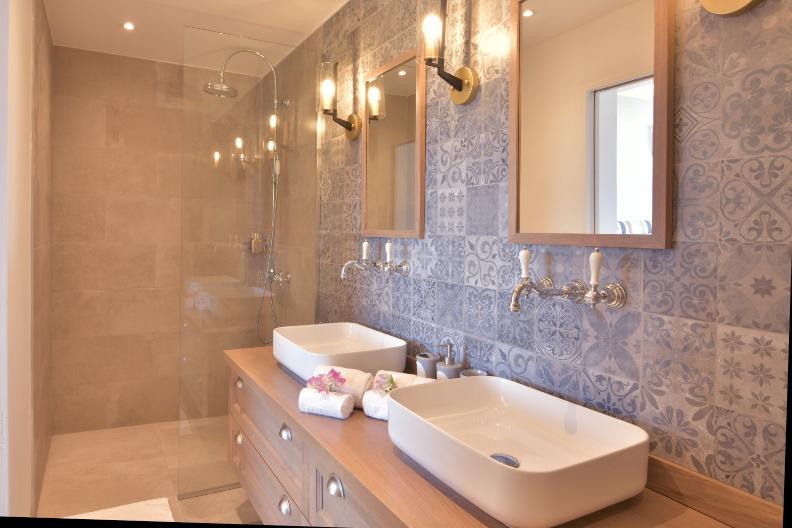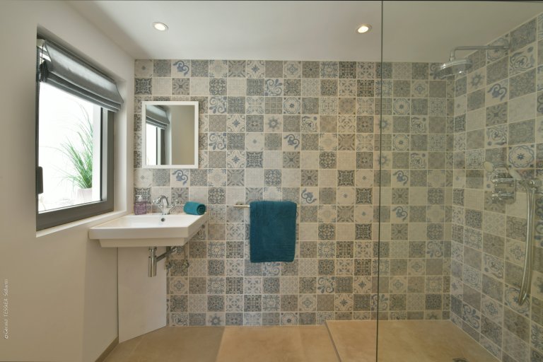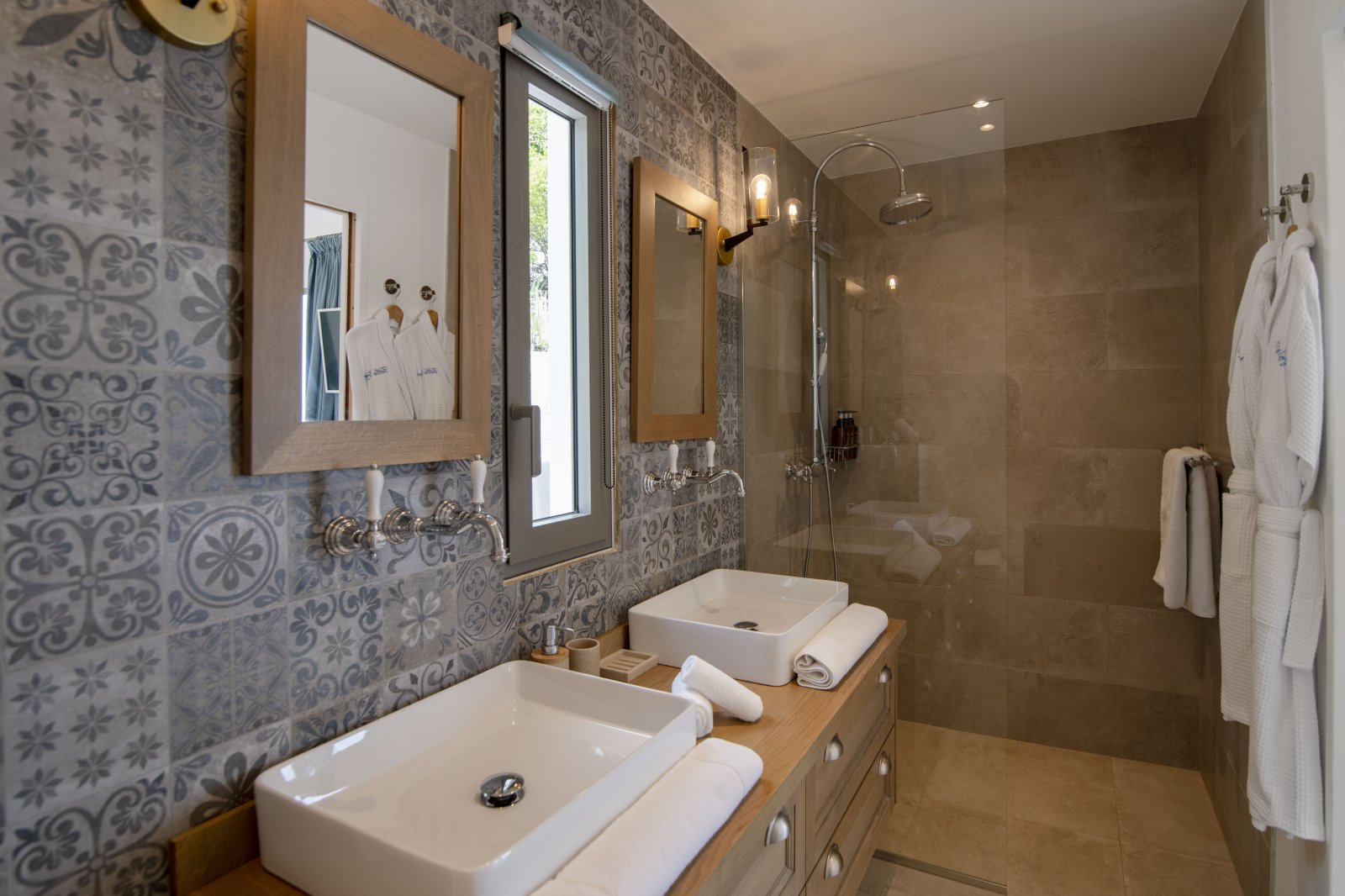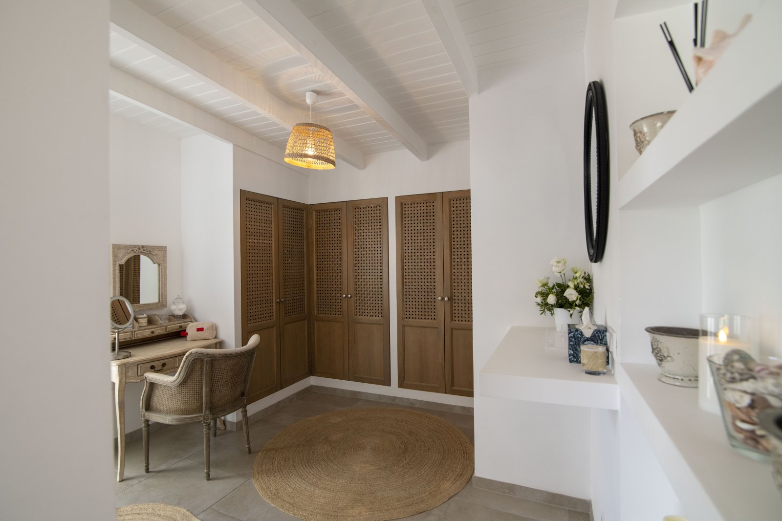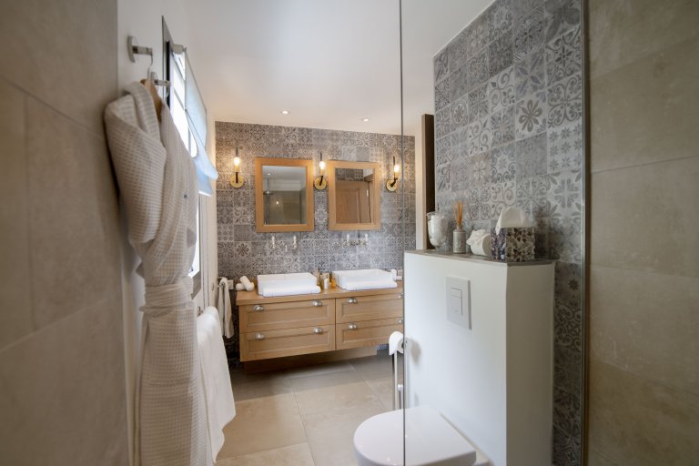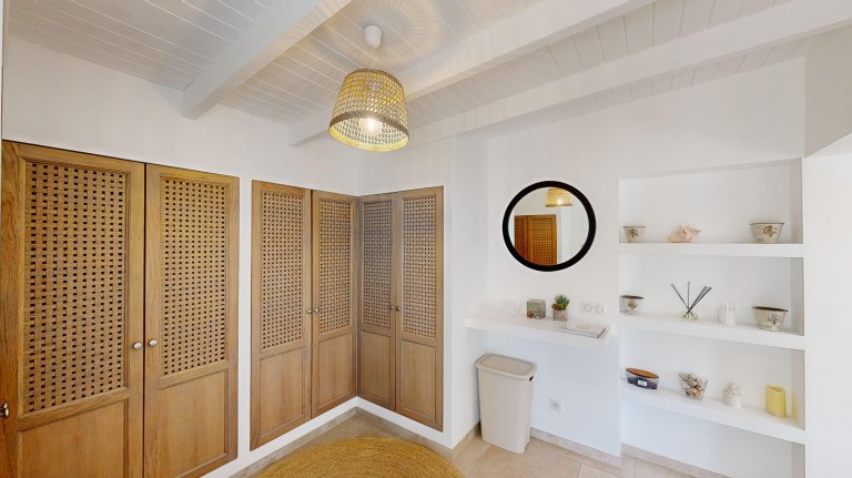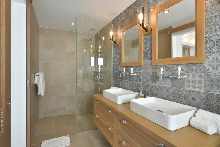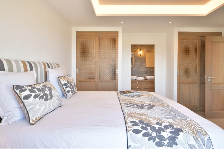 The five-bedroom layout offers both connection and privacy. One suite adjoins the living room, while a second sits in an independent bungalow on the same level. A third occupies its own pavilion beside the pool, with direct access to the terrace. On the lower level, a separate guest house hosts two additional bedrooms, complete with a kitchen, dining area, and private outdoor space—ideal for extended family, close friends, or accompanying staff.