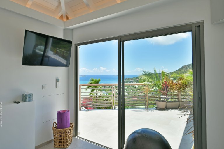 The main living area flows effortlessly, with a well-appointed kitchen that opens onto a shaded dining veranda—perfect for relaxed al fresco meals. A dedicated fitness room sits just beside the living space, allowing guests to maintain wellness routines throughout their stay.