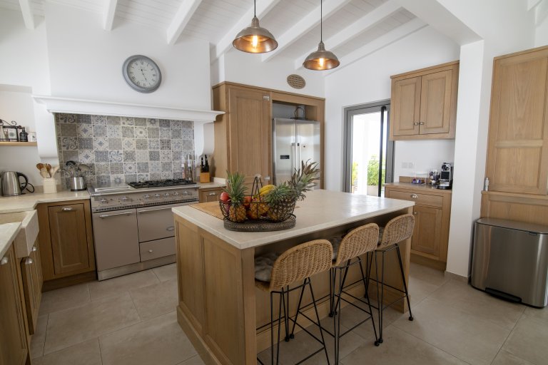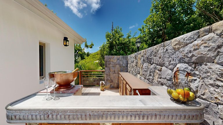 Outdoors, a heated pool takes center stage, complemented by a wet bar for poolside refreshments and casual gatherings. Sun loungers line the terrace, creating inviting spaces to unwind beneath the Caribbean sky.