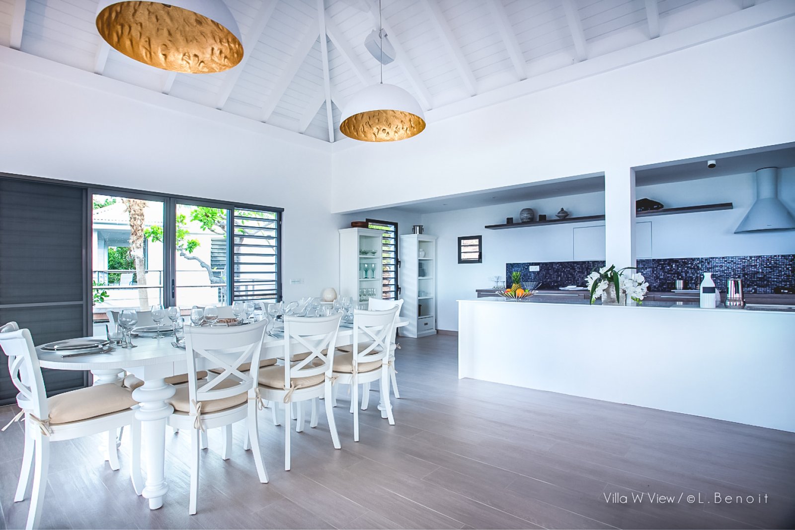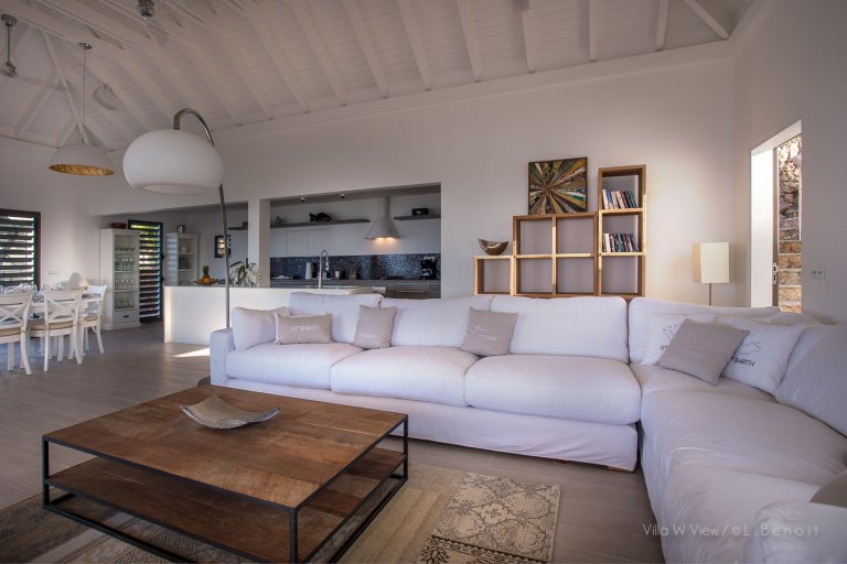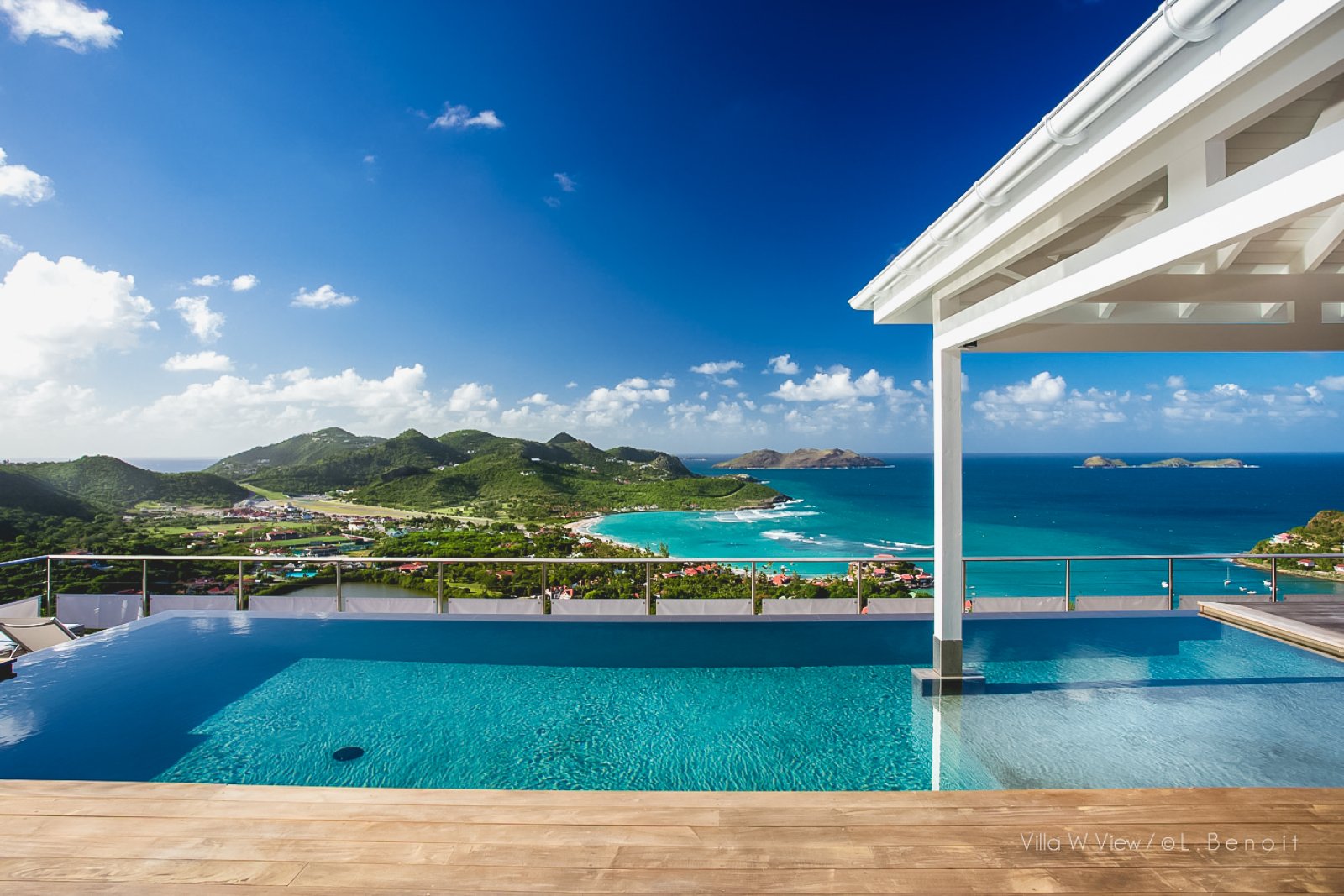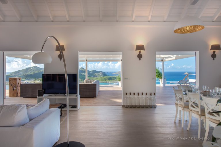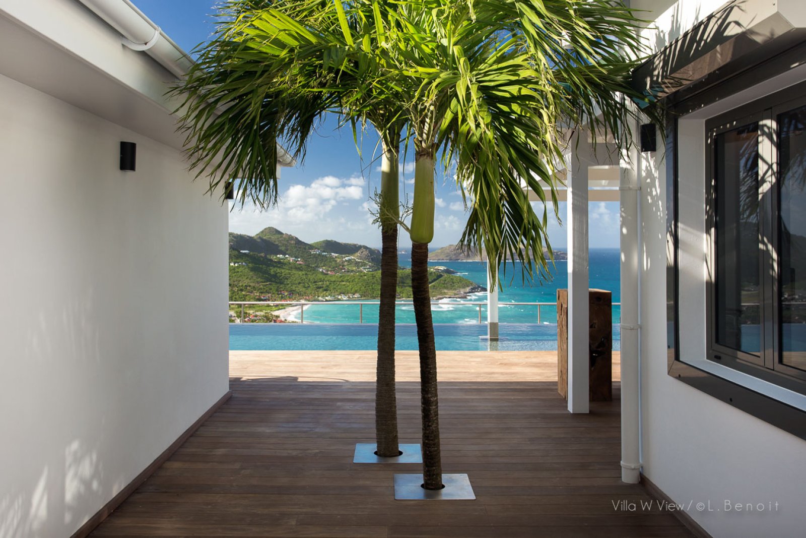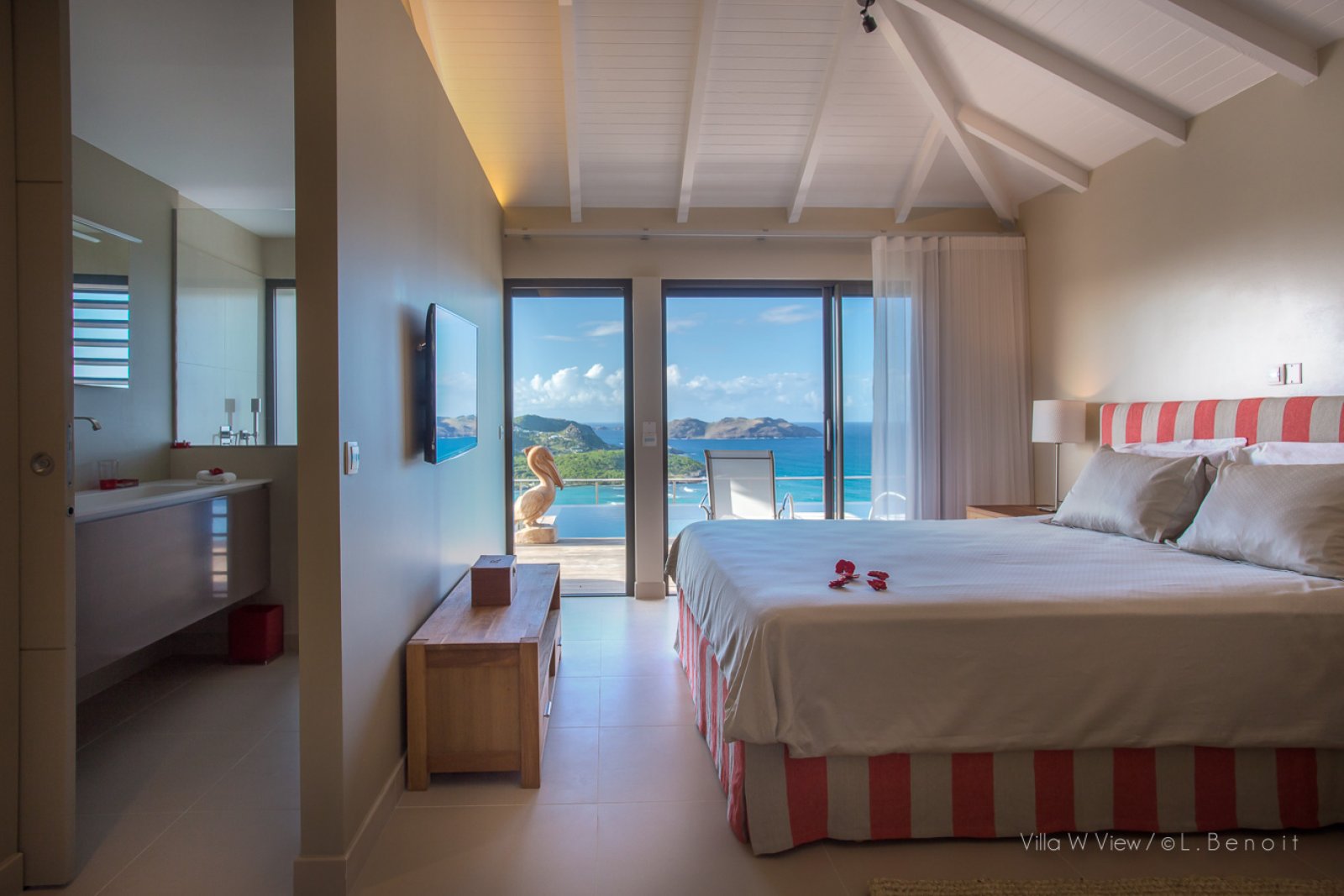Among the many luxuries to be discovered at Villa W View (WVU) is the abundance of light and space. The rooms of this vacation rental home are gracefully, generously proportioned, with large amounts of floor space, an open-plan design, high ceilings and wide walls of windows. The feeling they create is one of being at peace with nature, part of a glorious ecosystem of sea and sky, sunsets and stars. The ample living quarters are laid out in an intelligent fashion that allows for plenty of quality togetherness—without ever stepping on one another’s toes—and for some serious privacy. And at every turn, there are stellar views of the crashing waves of the Caribbean as the lap the shore of St. Jean Bay, far, far below, and seemingly a world away.