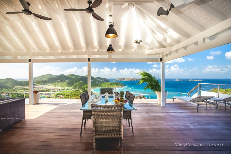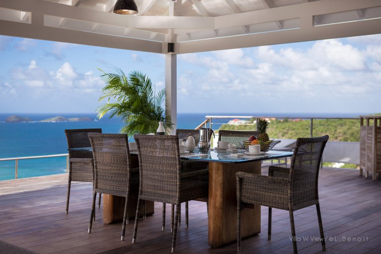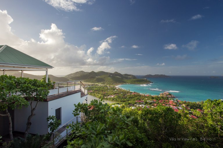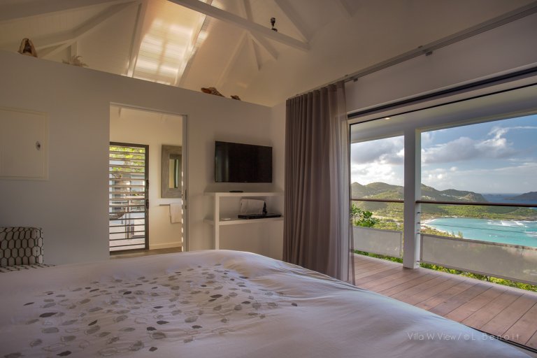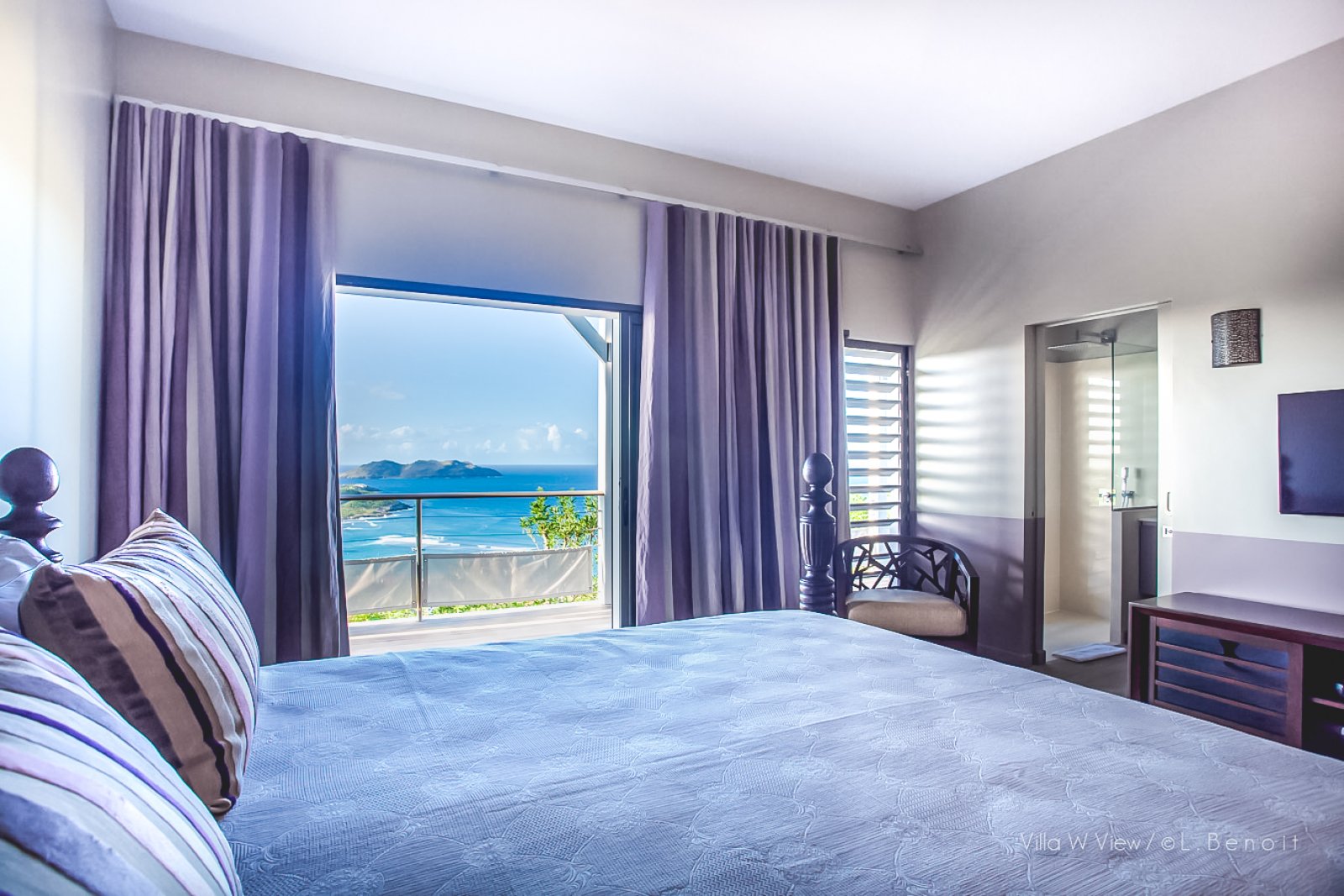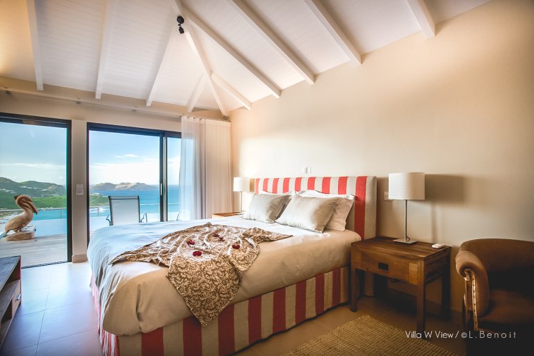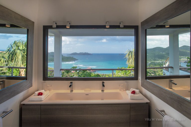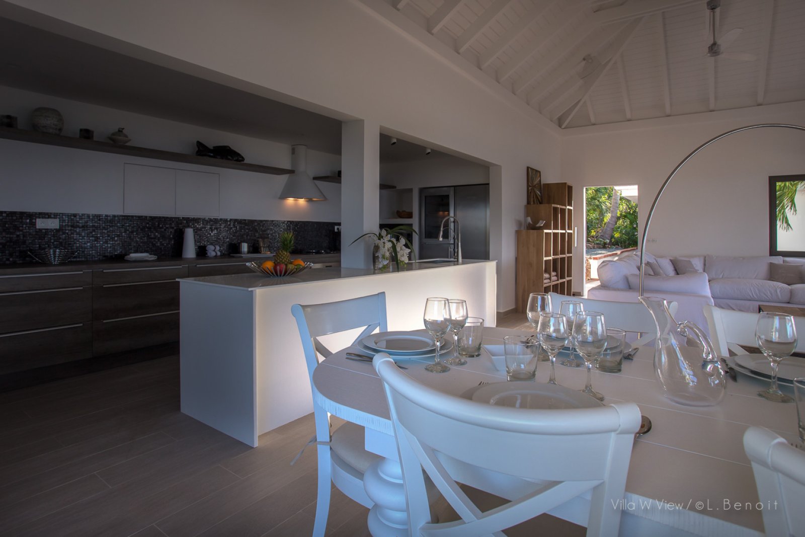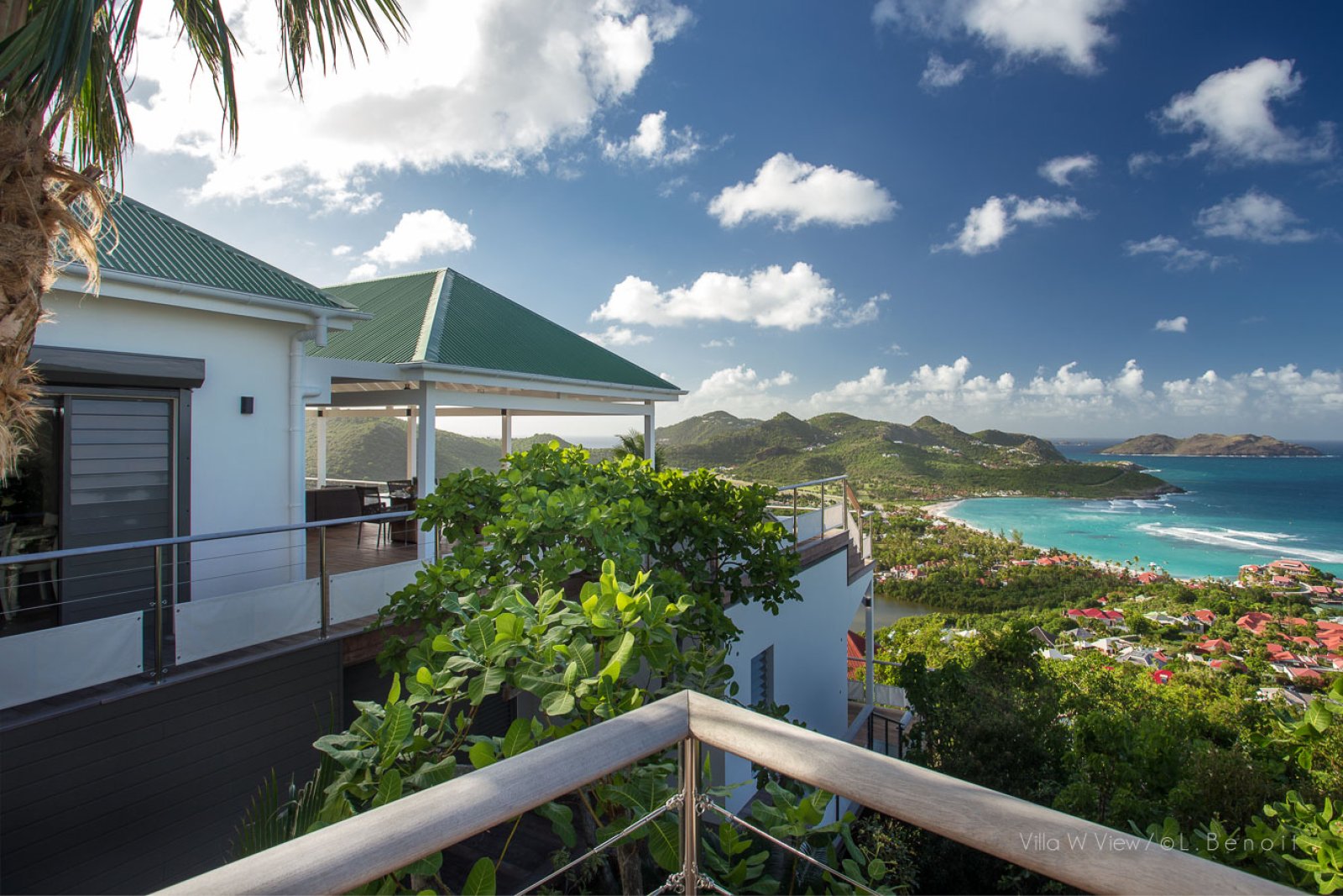 Among the many luxuries to be discovered at Villa W View (WVU) is the abundance of light and space. The rooms of this vacation rental home are gracefully, generously proportioned, with large amounts of floor space, an open-plan design, high ceilings and wide walls of windows. The feeling they create is one of being at peace with nature, part of a glorious ecosystem of sea and sky, sunsets and stars. The ample living quarters are laid out in an intelligent fashion that allows for plenty of quality togetherness—without ever stepping on one another’s toes—and for some serious privacy. And at every turn, there are stellar views of the crashing waves of the Caribbean as the lap the shore of St. Jean Bay, far, far below, and seemingly a world away.