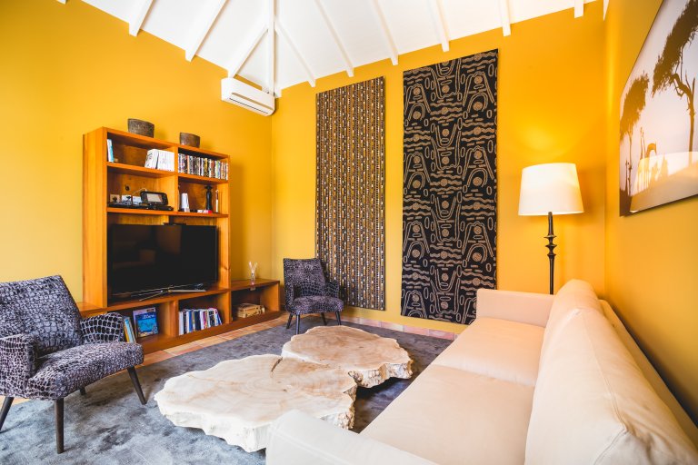 A separate, larger bungalow contains the living room, which has a comfortable L-shaped sofa, a plush armchair, a big TV, and views over the pool. There are two bedrooms on opposite sides of this living room, each with a queen bed. One of these has access to the pool; the other to a side deck. A floating staircase goes up to the large master bedroom, which has a king bed. The fourth bungalow occupies its own bungalow near the entrance to the villa compound, which also contains a TV room decorated in African style.
