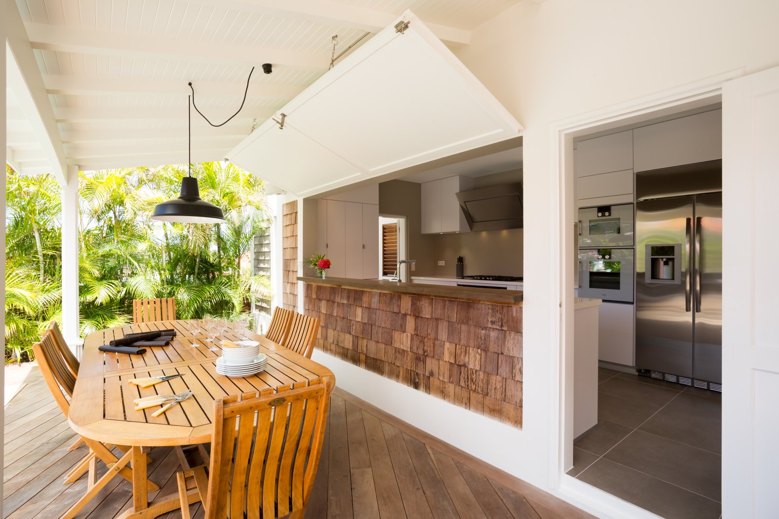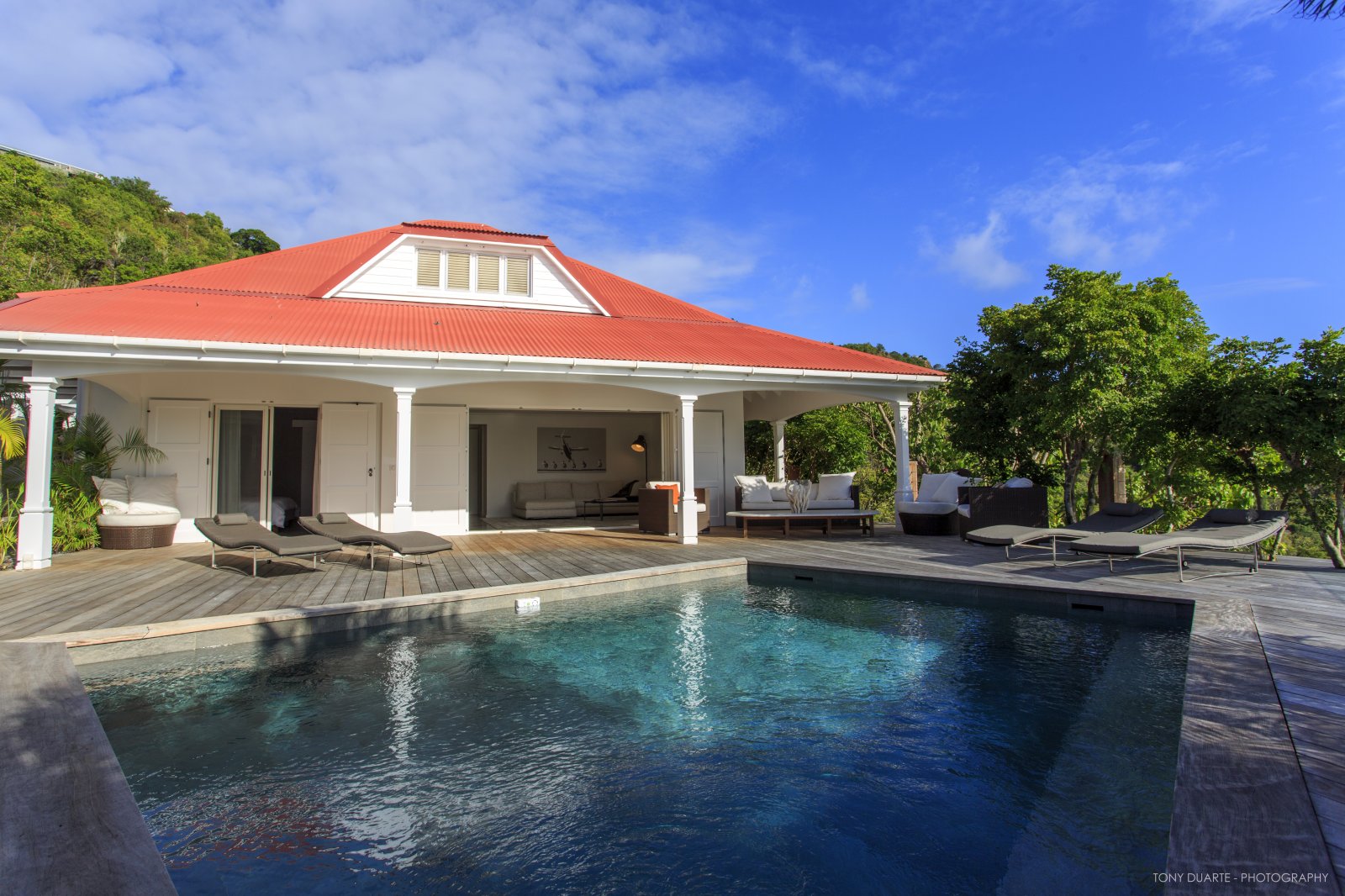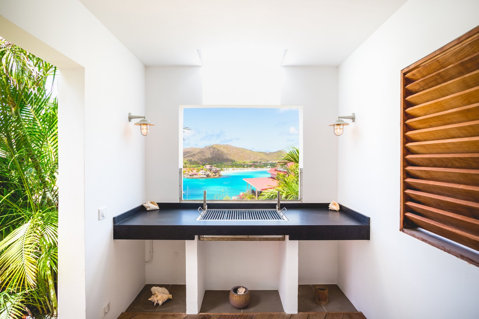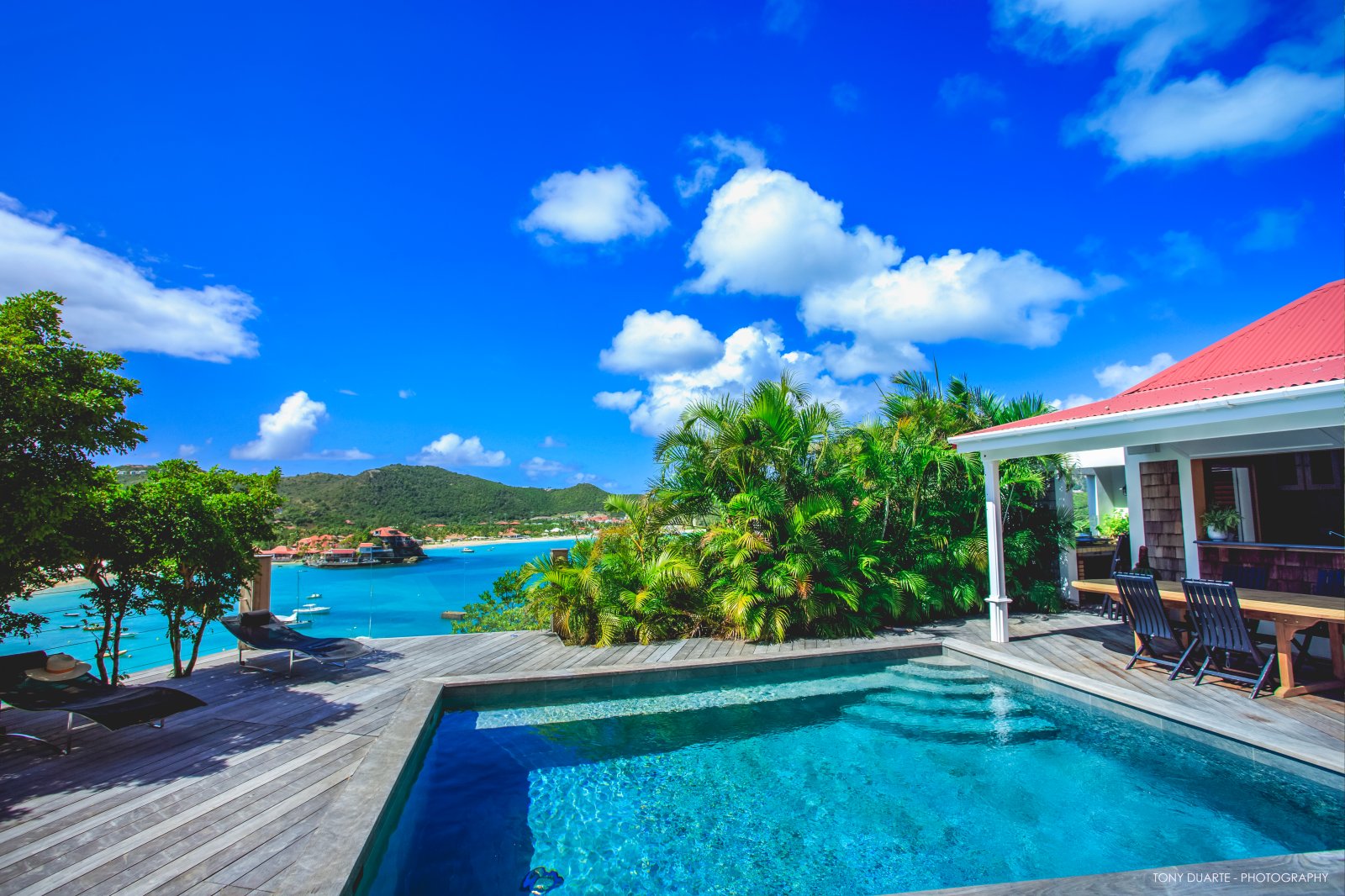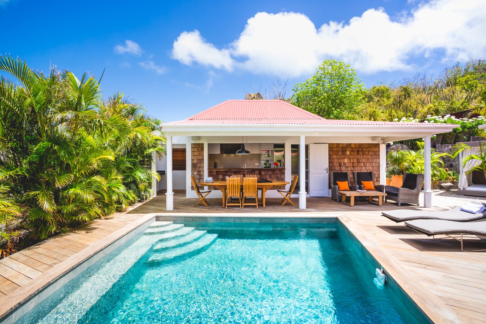 The property consists of three freestanding bungalows. A kitchen bungalow has a partial view of St. Jean Bay and a connected outdoor counter and grill. It opens onto a shaded dining terrace for six in front of the pool, which in turn leads to a sunny poolside area with lounge chairs for sunbathing and socializing.