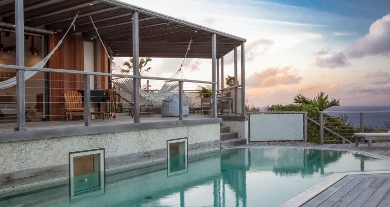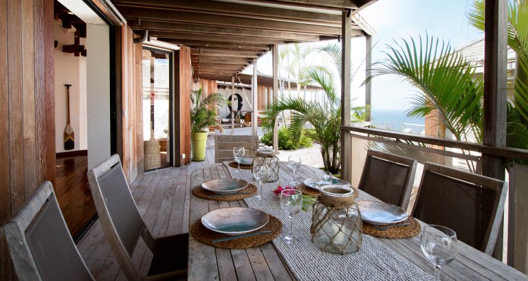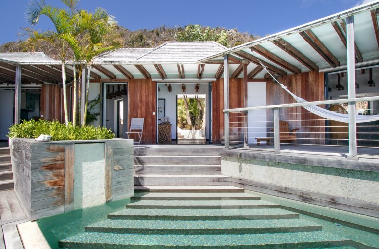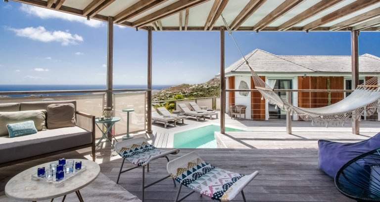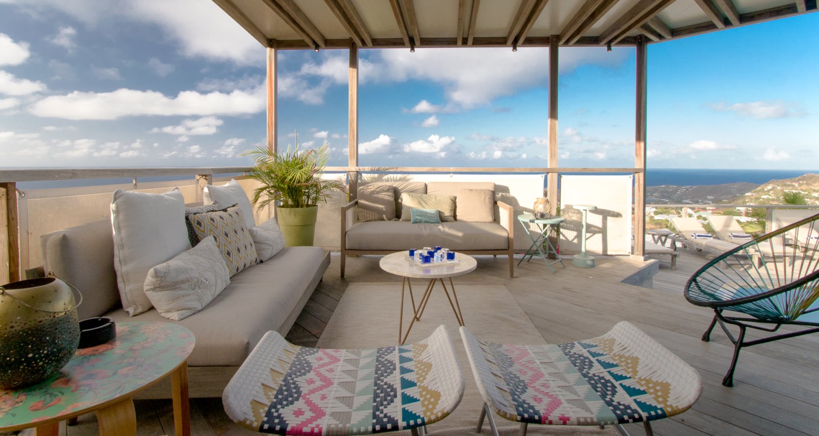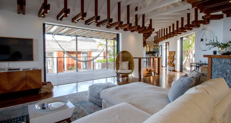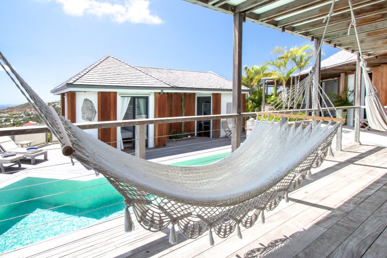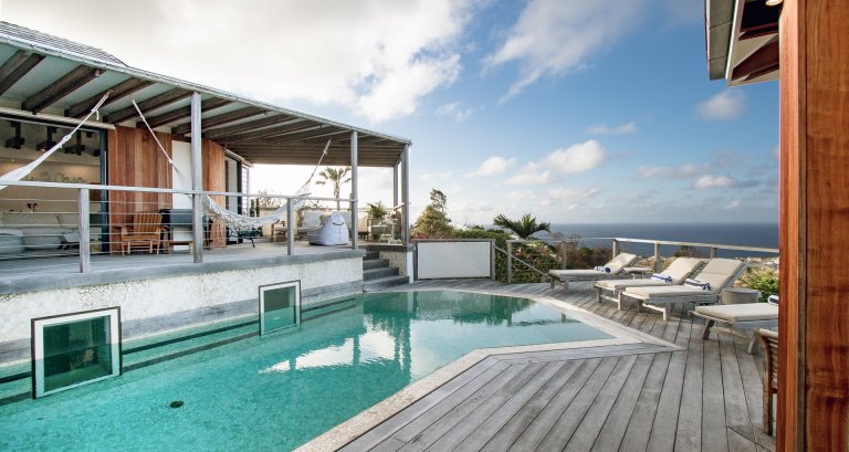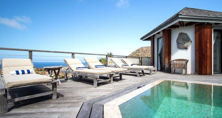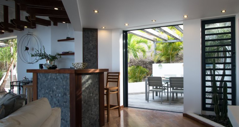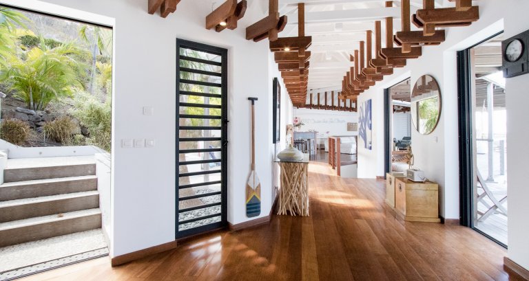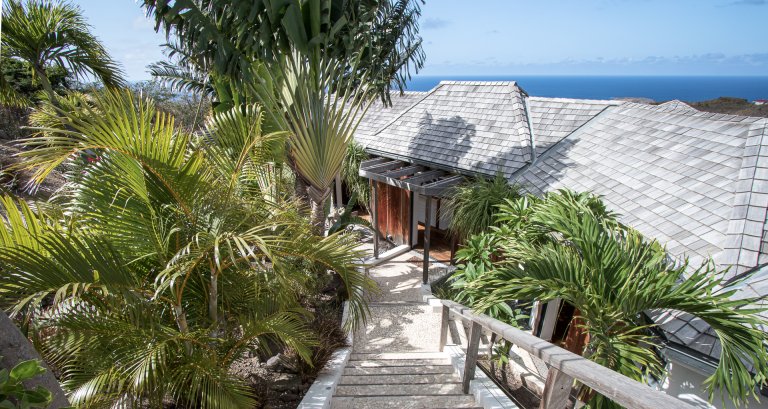 High on a Vitet hillside with sweeping views over the island's green hills and the wide blue Atlantic, Villa Kaya (KYA) is an architecturally unique home, full of intriguing eye candy and yet perfectly suited to a relaxed Caribbean vacation. The luxury rental property was designed by its owner, who paid careful attention to every detail and brought in a team of skilled artisans to work with the finest natural materials. Exposed wooden beams on the ceiling add distinct character. But for all the beauty and elegance, the villa has a cozy and comfortable charm—it is very much in the spirit of St. Barth.