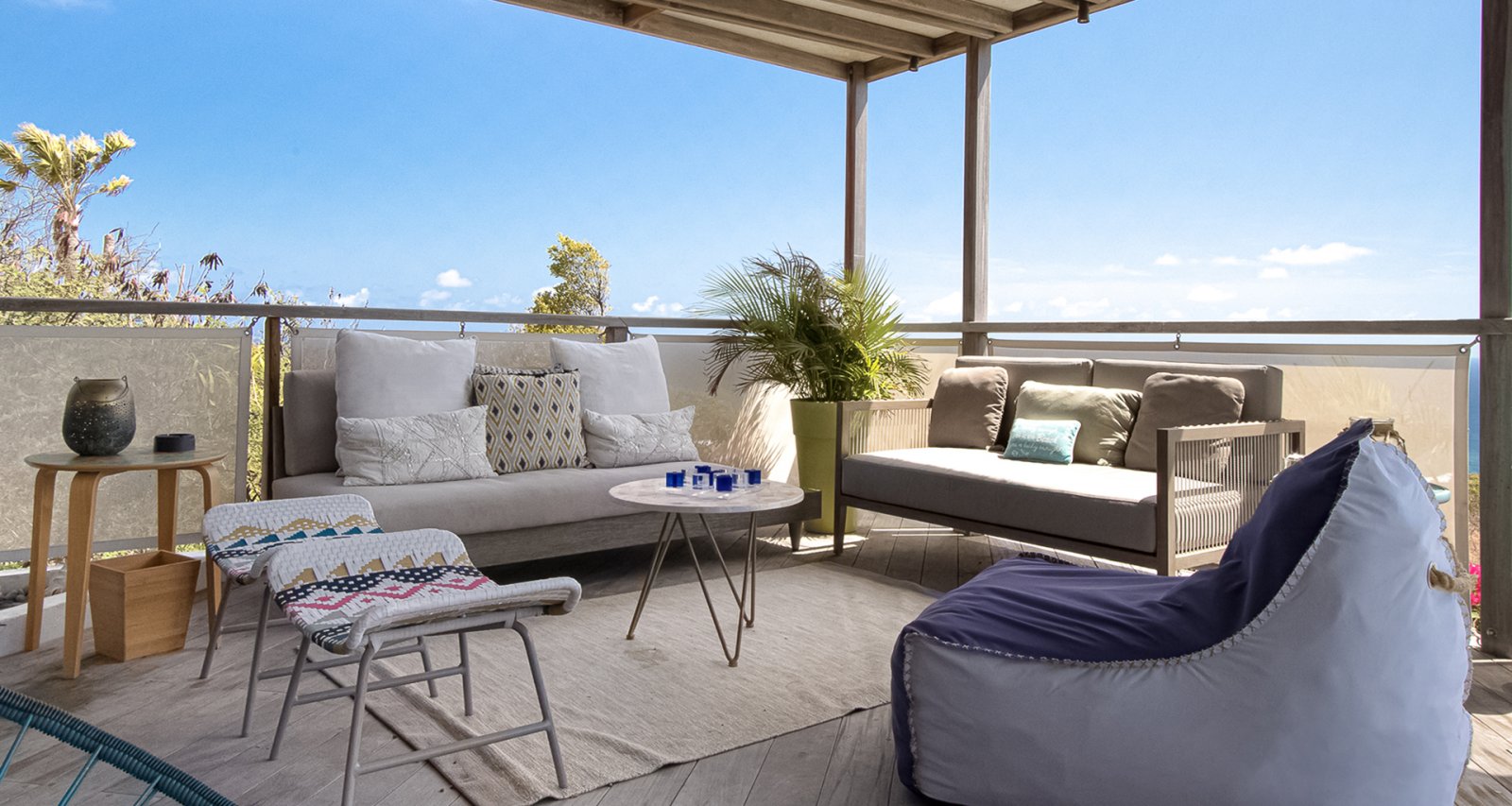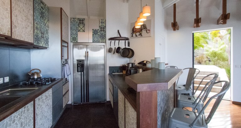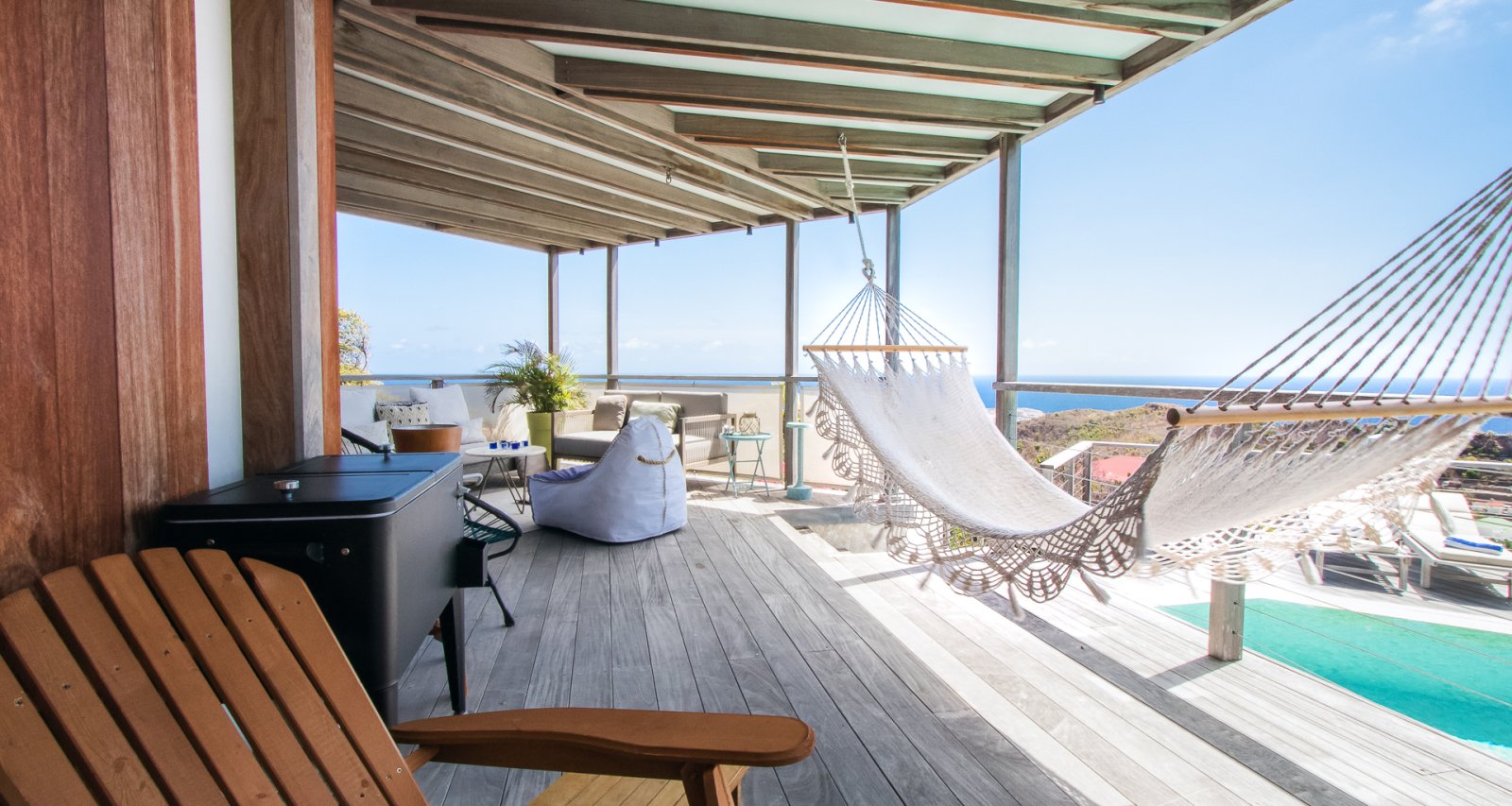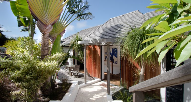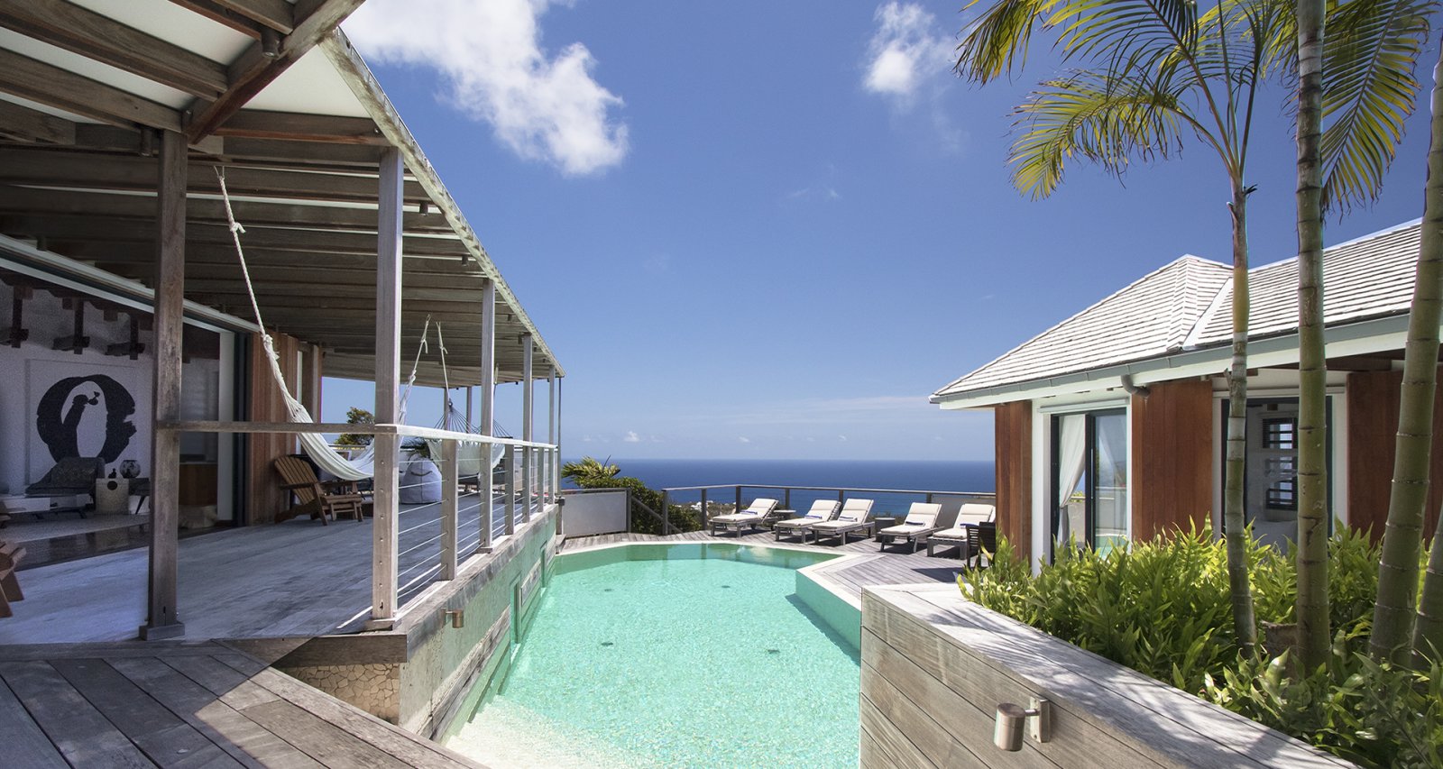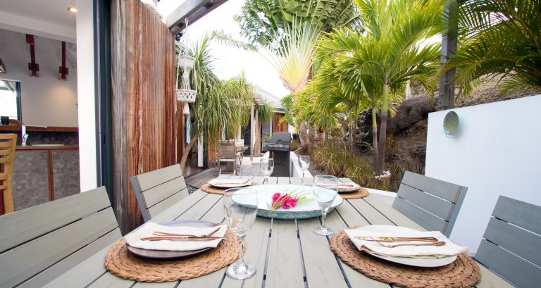High on a Vitet hillside with sweeping views over the island's green hills and the wide blue Atlantic, Villa Kaya (KYA) is an architecturally unique home, full of intriguing eye candy and yet perfectly suited to a relaxed Caribbean vacation. The luxury rental property was designed by its owner, who paid careful attention to every detail and brought in a team of skilled artisans to work with the finest natural materials. Exposed wooden beams on the ceiling add distinct character. But for all the beauty and elegance, the villa has a cozy and comfortable charm—it is very much in the spirit of St. Barth.
