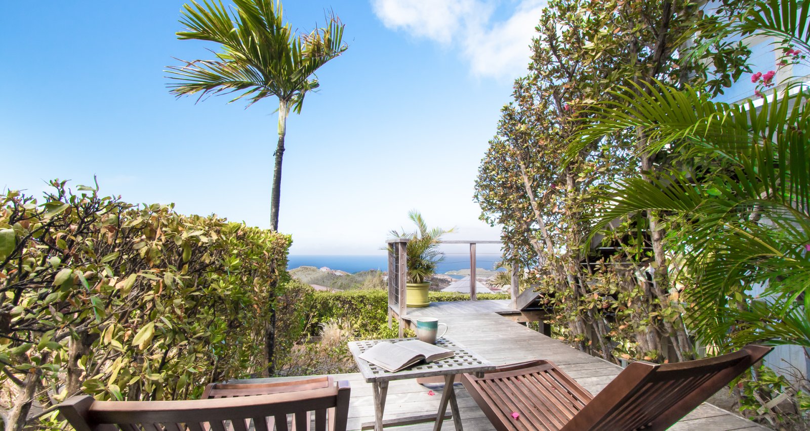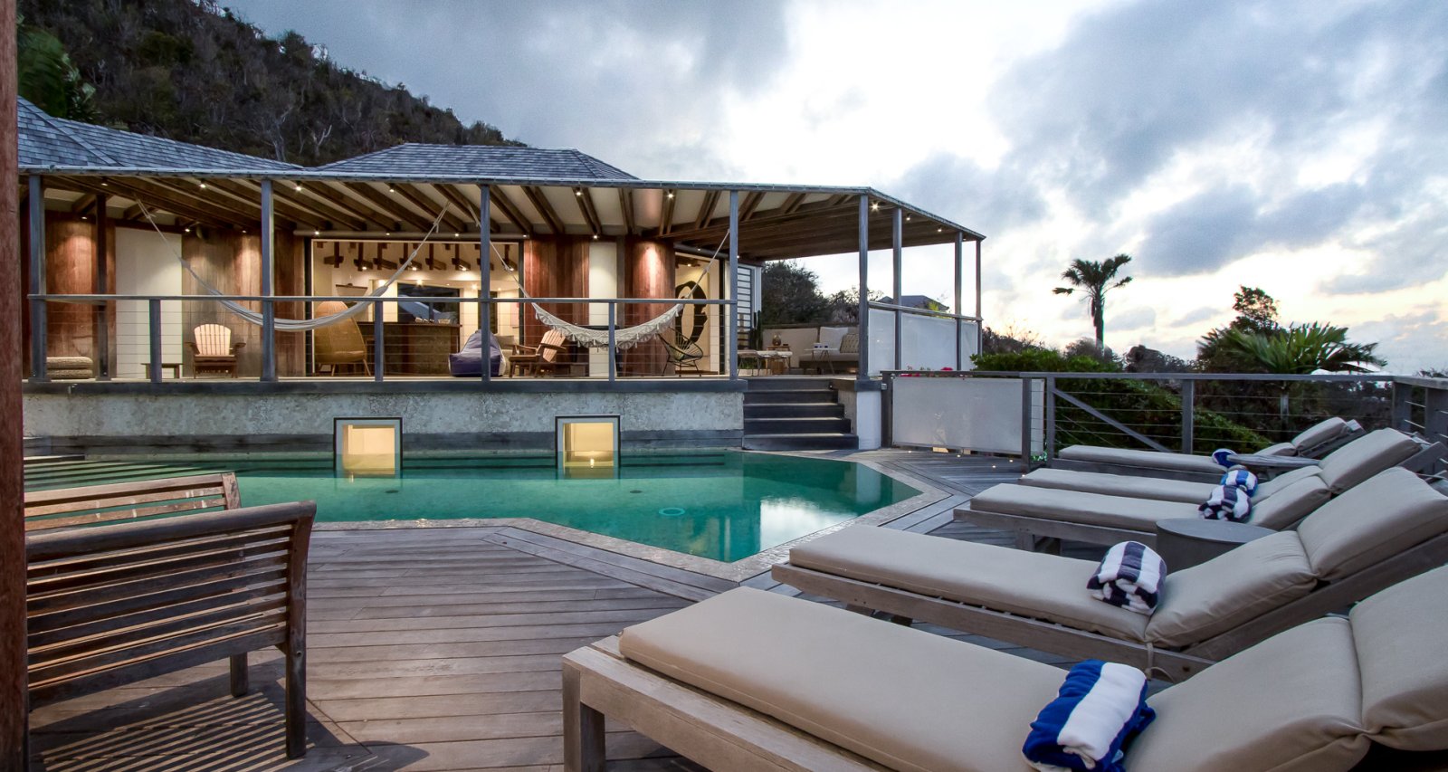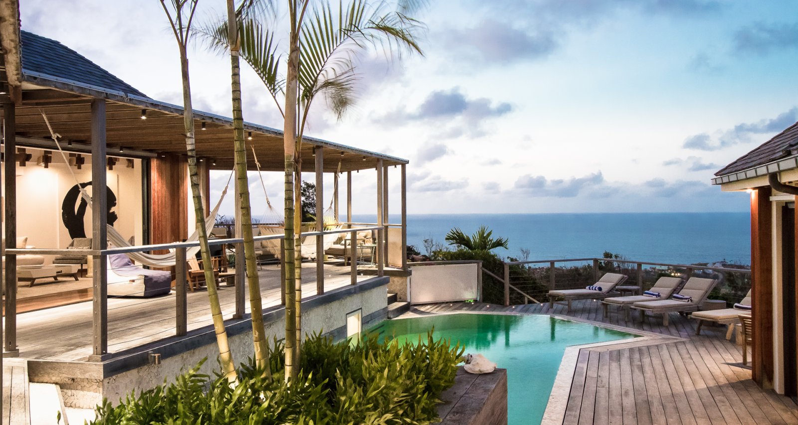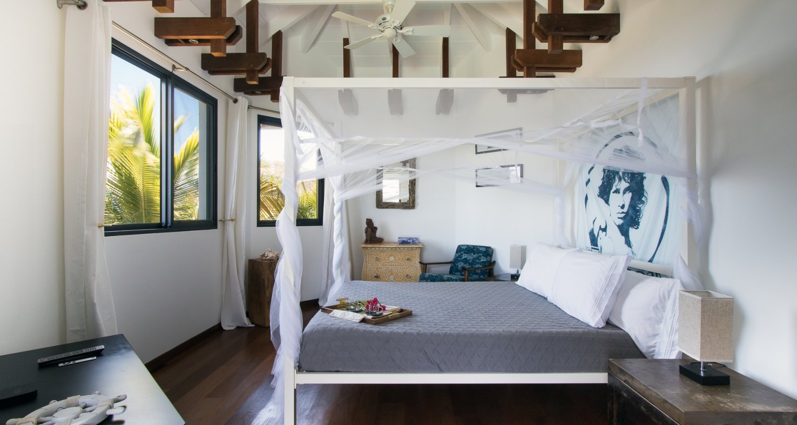 High on a Vitet hillside with sweeping views over the island's green hills and the wide blue Atlantic, Villa Kaya (KYA) is an architecturally unique home, full of intriguing eye candy and yet perfectly suited to a relaxed Caribbean vacation. The luxury rental property was designed by its owner, who paid careful attention to every detail and brought in a team of skilled artisans to work with the finest natural materials. Exposed wooden beams on the ceiling add distinct character. But for all the beauty and elegance, the villa has a cozy and comfortable charm—it is very much in the spirit of St. Barth.