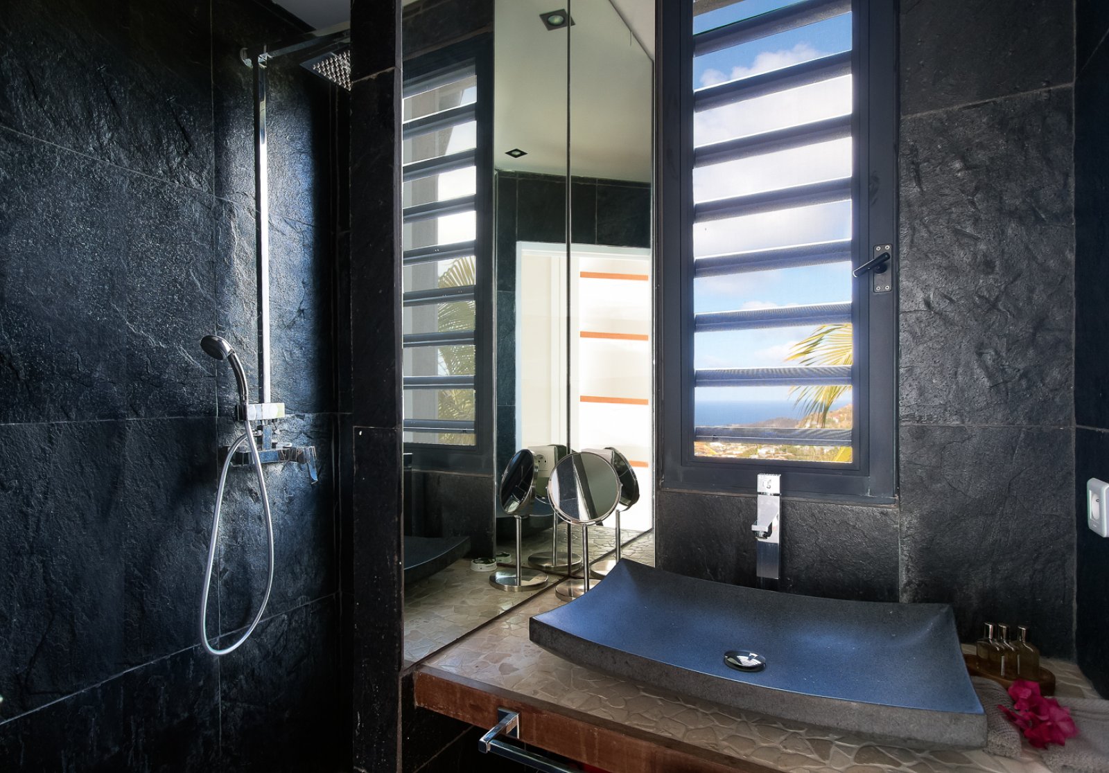 The master bedroom lies down one flight of stairs. Its unique architectural features include two windows situated below the water level of the pool, giving the room an unusual underwater view. This room also has a private deck and indoor sitting areas. The other two bedrooms are in a separate pavilion. Each of the bedrooms has an ensuite bathroom with a shower.