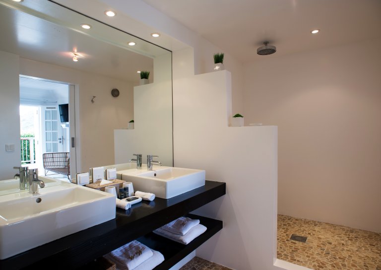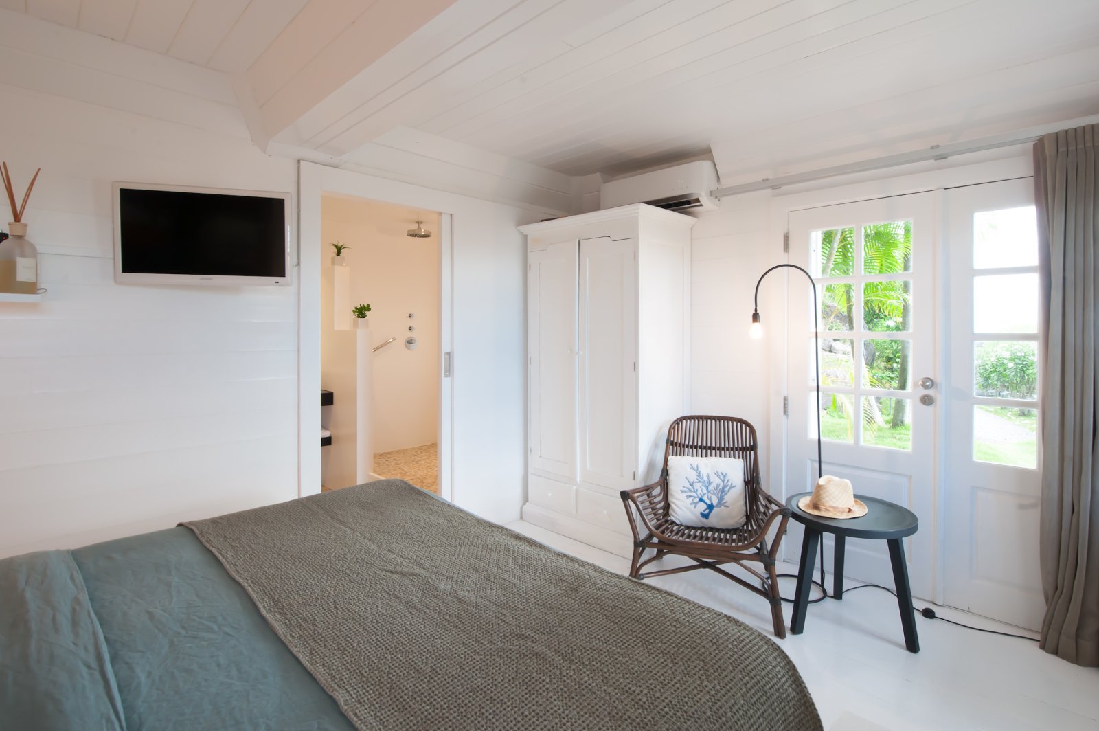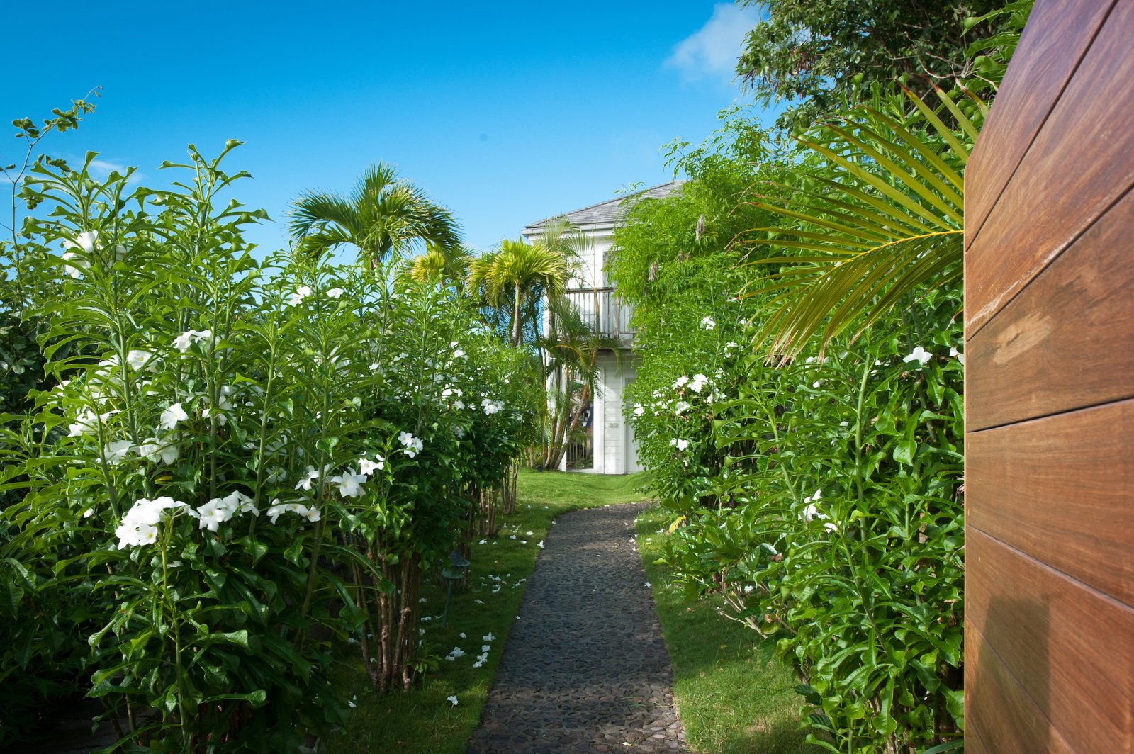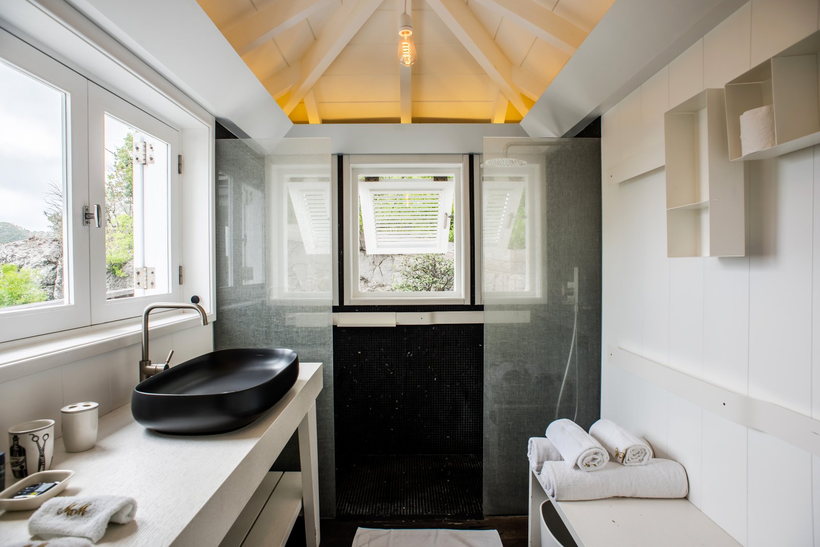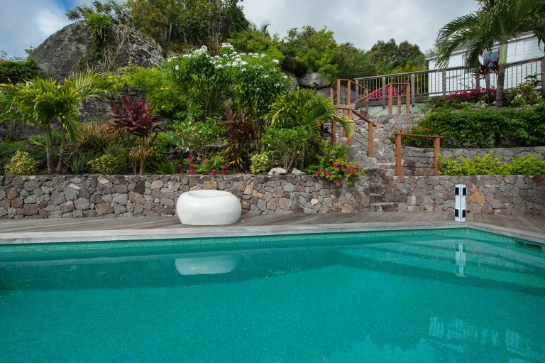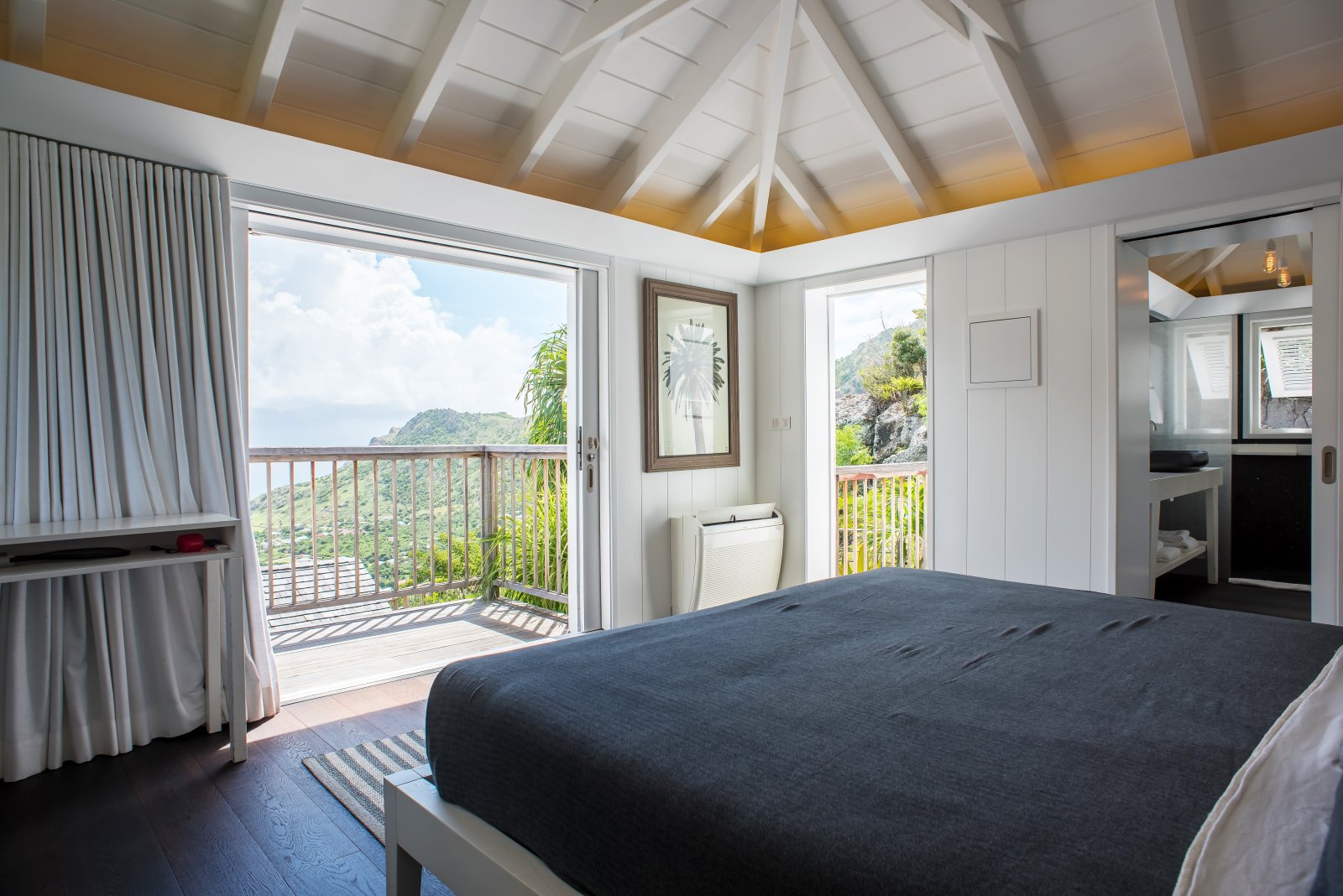 On the main terrace level, the pool, deck and covered seating provide a picture-postcard view and a serene environment for spending an afternoon with a good book and cold drink. The well-equipped kitchen is convenient and efficient, with a French country style center island, modern appliances and indoor seating looking out over the magnificent view. The adjacent living area is large and comfortable, a great place to escape from the sun for a while or to watch a film after dinner on the terrace. Two of the bedrooms are situated on the garden level below and are equal in size and amenities. The master bedroom is situated in its own bungalow a few steps up from the main house.