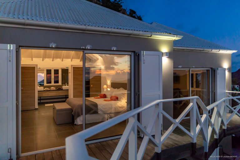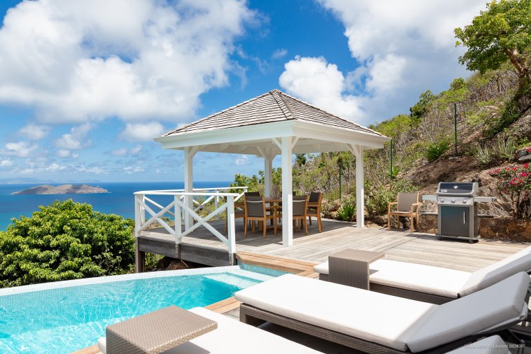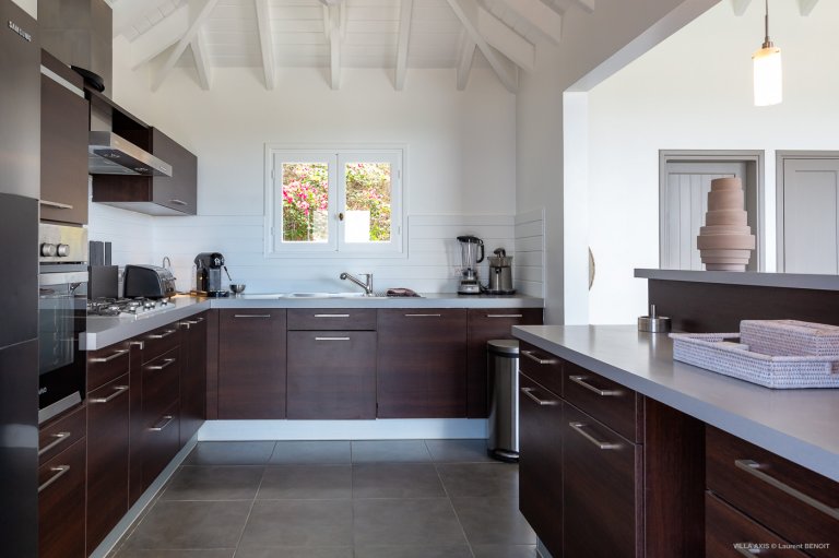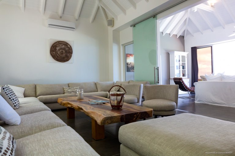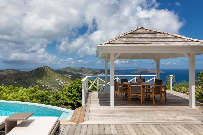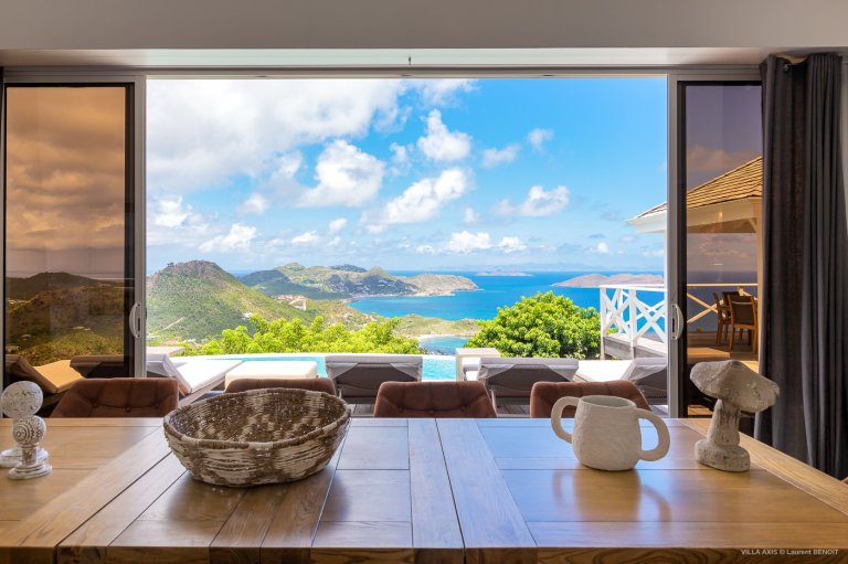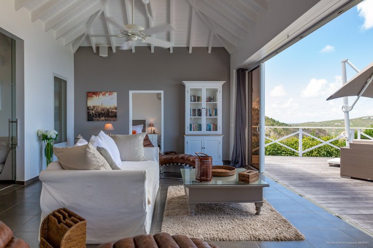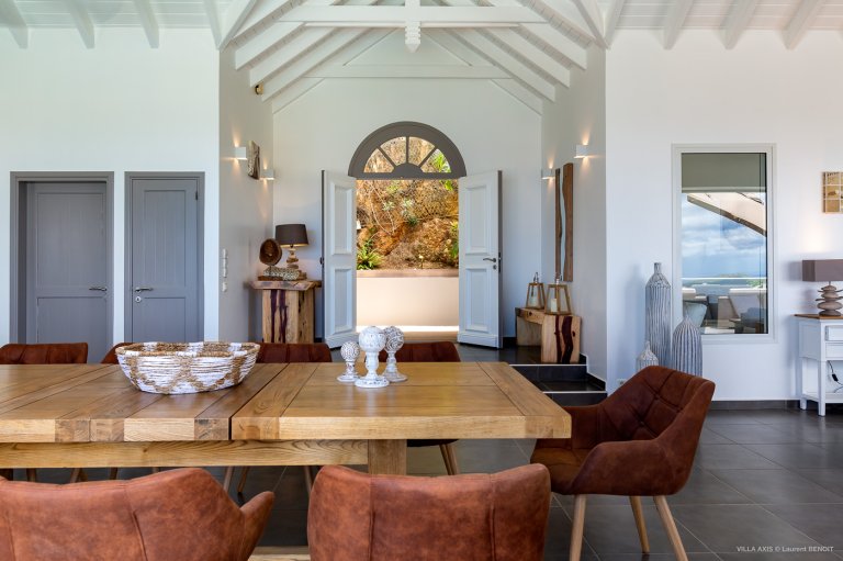 Situated in the quiet hillside neighborhood of Petite Saline, looking out over the picturesque Lorient Bay, Villa Zetes (ZTS) offers modern comfort and stunning views. From this high vista, you can see the far western end of St. Barth as well as the islands of St. Maarten and Anguilla on a clear day. The open living and dining area features striking contemporary design not typically found in a Caribbean villa. The style of Villa Zetes stands out through a melding of materials, from highly polished hardwoods to gleaming stainless steel and glass. The dining table provides seating for 10, and the front living area offers comfortable seating for reading or relaxing and taking in the view. In air-conditioned rear living area, closed off by sliding glass doors, you will find a comfortable sofas for watching TV.