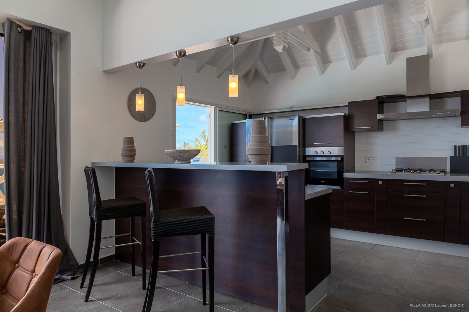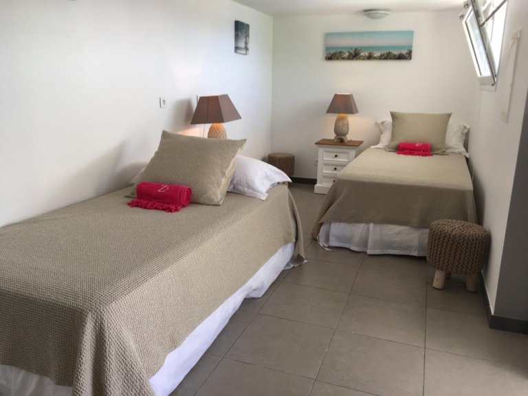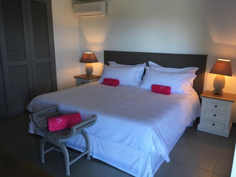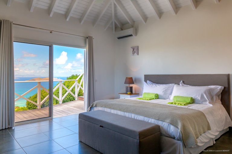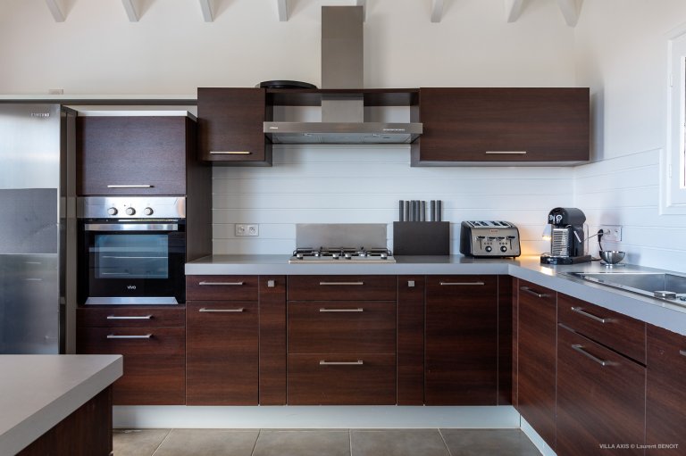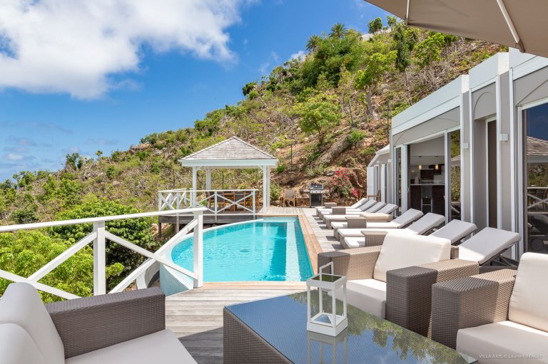 Situated in the quiet hillside neighborhood of Petite Saline, looking out over the picturesque Lorient Bay, Villa Zetes (ZTS) offers modern comfort and stunning views. From this high vista, you can see the far western end of St. Barth as well as the islands of St. Maarten and Anguilla on a clear day. The open living and dining area features striking contemporary design not typically found in a Caribbean villa. The style of Villa Zetes stands out through a melding of materials, from highly polished hardwoods to gleaming stainless steel and glass. The dining table provides seating for 10, and the front living area offers comfortable seating for reading or relaxing and taking in the view. In air-conditioned rear living area, closed off by sliding glass doors, you will find a comfortable sofas for watching TV.