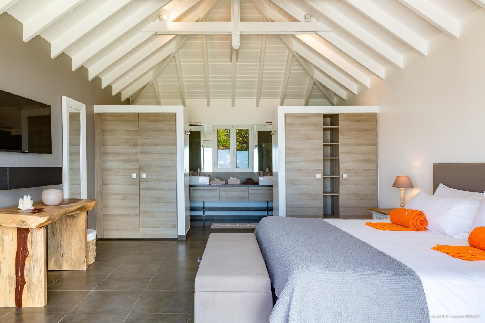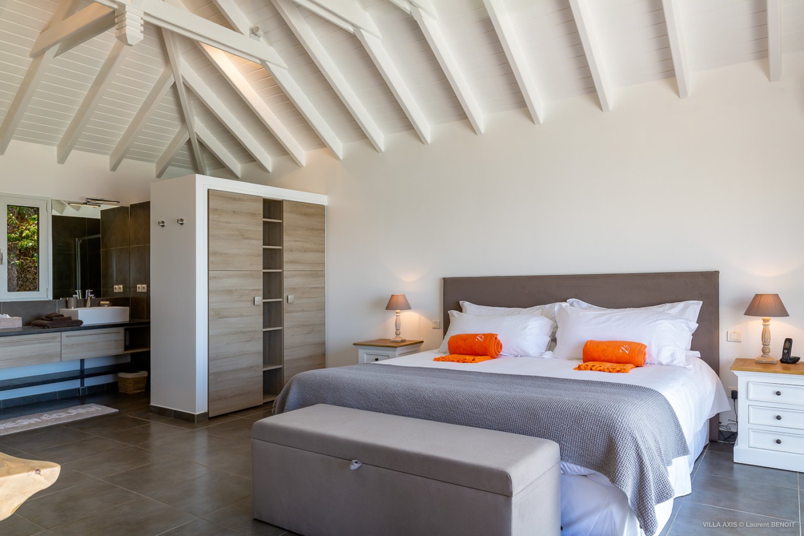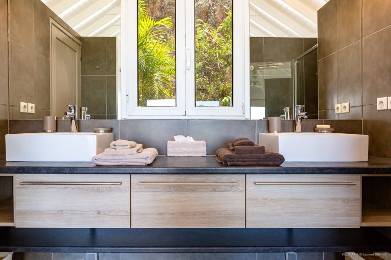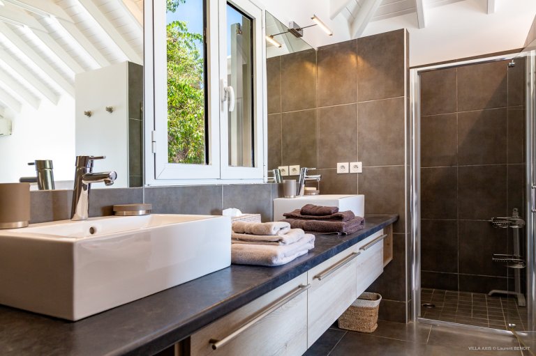 Two of the bedrooms are upstairs. The first one is on one side of the living room and the second one, nearby the first one, has a separate entrance accessiblle from the outside. The two other bedrooms are located downstairs. All bedrooms have an ensuite bathroom. The half-moon infinity pool is surrounded by a teak deck that makes it the ideal spot for relaxing in the sun and admiring the panoramic view.